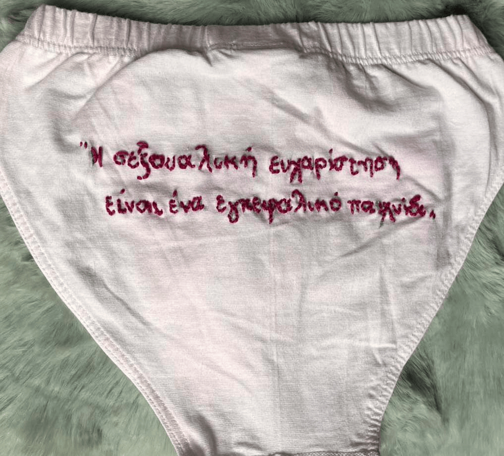 The central step was deciding where to place these powerful quotes. We chose the underwear garment—the most intimate piece of clothing—as the perfect medium for a political statement. This decision transforms the garment from a simple object into a visible carrier of personal truths. The quotes were then carefully embroidered onto the fabric, a slow process chosen to emphasize care and permanence. This technique highlights the themes of shame, pleasure, and autonomy directly onto the body, turning the intimate act of wearing underwear into a subtle, personal act of empowerment and awareness.